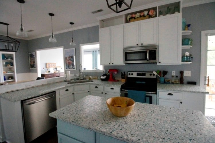 Tonjolkan tema laut dapur Anda dengan mengecat meja island dengan warna biru muda, sedangkan kabinet-kabinet tetap menggunakan warna putih untuk menampilkan sisi elegan. Dengan motif kaca daur ulang seperti ini, Anda bisa bebas meletakkan peralatan atau dekorasi dengan warna apa pun.