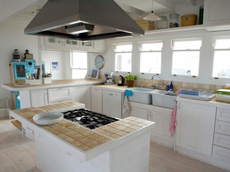 Keramik bisa dipasang pada meja dapur berbahan beton atau bata. Untuk tampilan dapur yang bersih dan terang, Anda bisa memasang keramik berwarna krem di atas kabinet dan meja island berwarna putih. Tak perlu takut kotor karena keramik sangat mudah dibersihkan, kecuali bagian garis nat-nya.