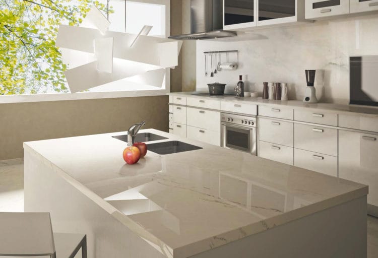 Meja dapur dari kuarsa buatan memiliki permukaan yang lebih halus dan sangat awet. Hanya saja, warnanya terbatas pada warna putih dengan bintik-bintik kehitaman. Namun, jangan khawatir, motif ini justru membuat tampilan meja dapur Anda menjadi elegan dan berkelas.
